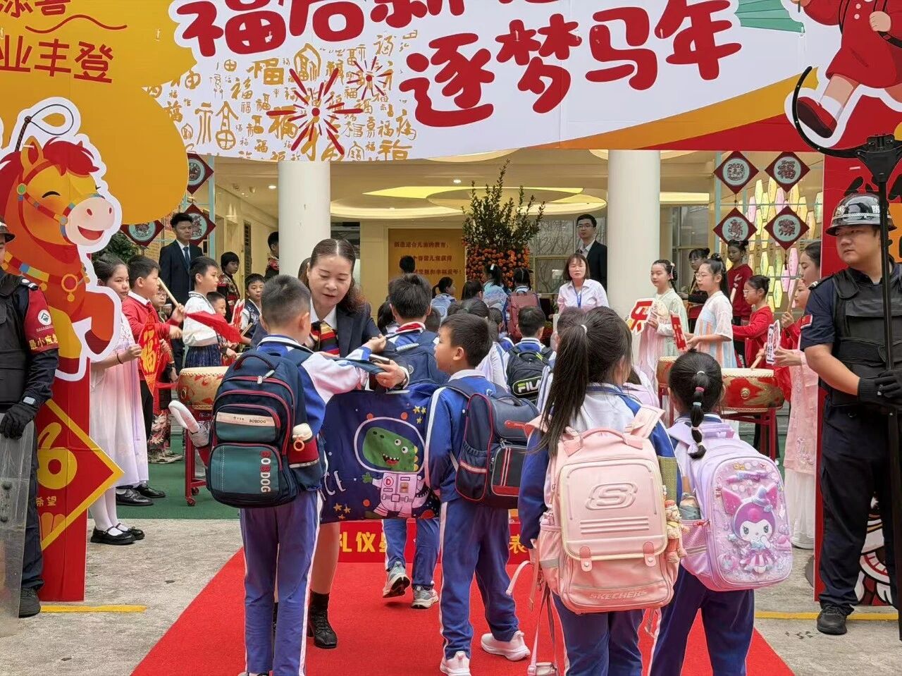 清晨的校园,暖意融融、活力涌动。校领导、全体教师、舞狮队以及礼仪岗的同学们早早在校门口等候,用灿烂的微笑、亲切的问候,迎接每一位同学的到来。孩子们身着整洁的校服,背着装满憧憬的书包,带着假期的喜悦与对新学期的期待,有序步入校园。一声声清脆的“老师好”“同学好”,打破了清晨的宁静,久违的热闹与生机洒满校园的每个角落,处处洋溢着少年的朝气与奋进的希望。