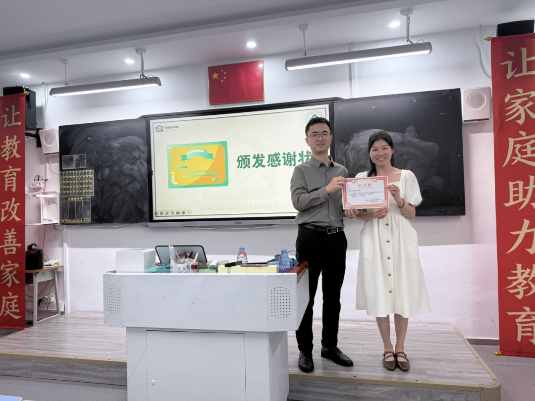 活动尾声,学校领导发表总结讲话,对讲师的专业引领与家长的积极参与表示衷心感谢。学校表示,将持续依托 "幸福家长学校" 平台,开展更多实用、优质的家庭教育课程,与家长同心同向、紧密合作,共同守护孩子健康成长。为致谢讲师的倾情分享,学校特别颁发感谢状,为家校共育注入更强动力。