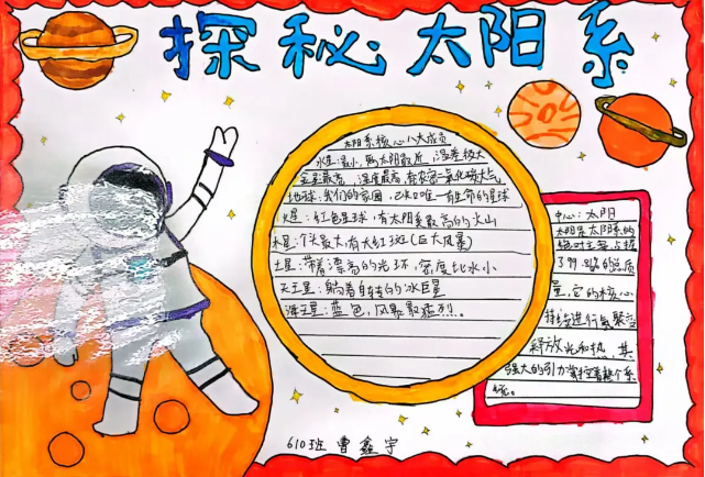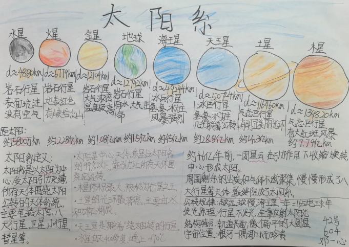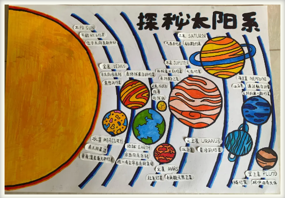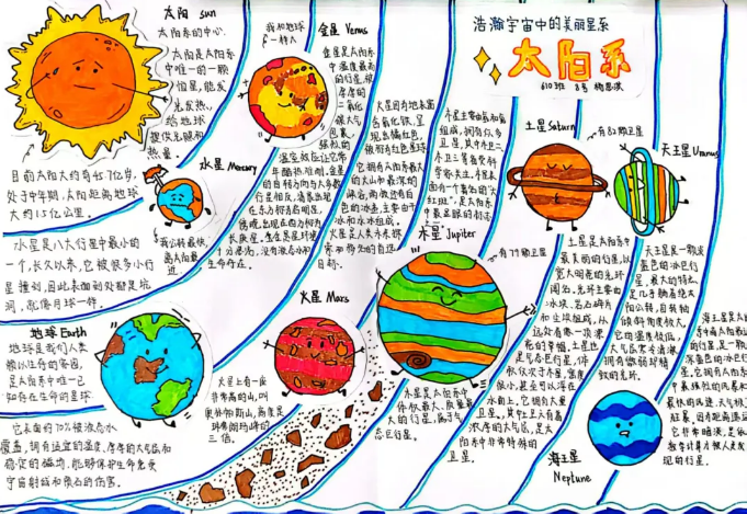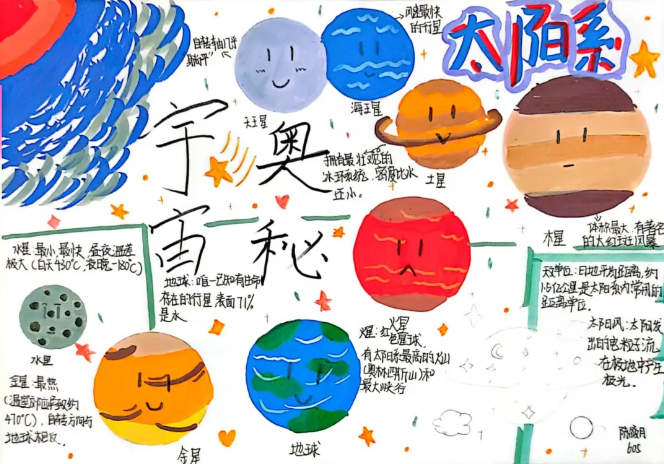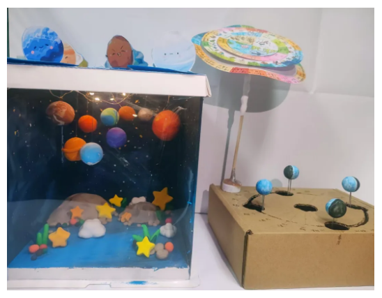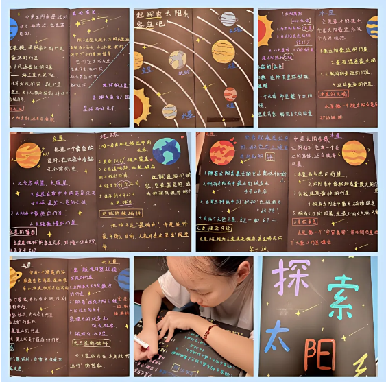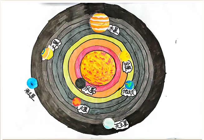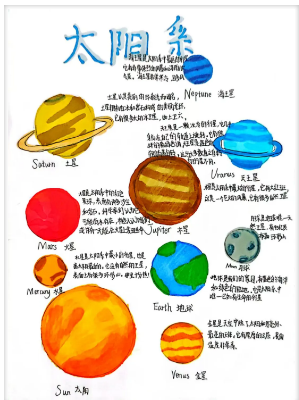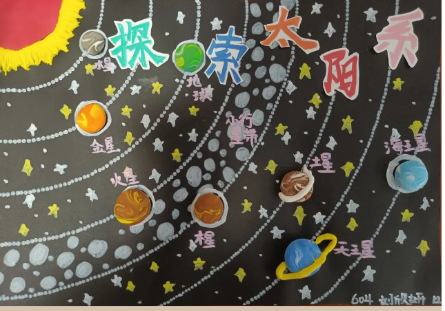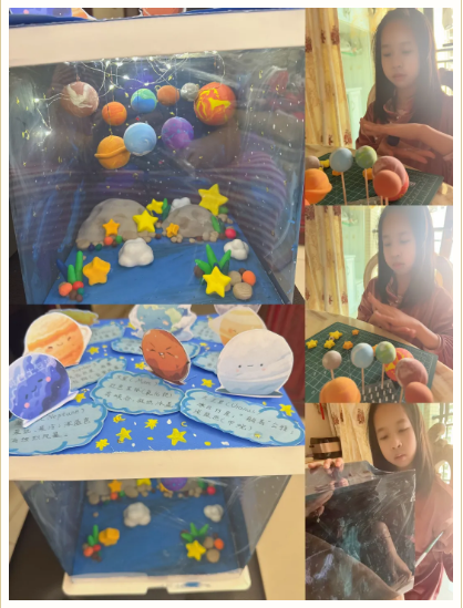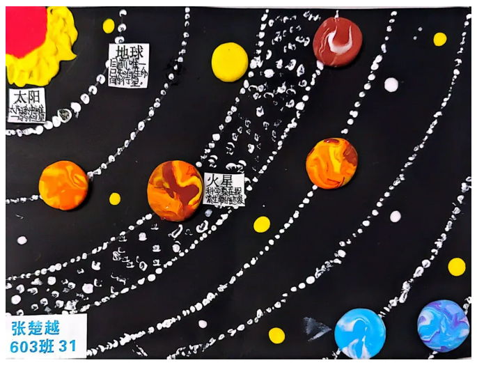 活动中,同学们创意迸发,佳作频出。作品形式丰富多样、制作精良,兼具科学性与艺术性:超轻粘土模型立体还原行星形态与比例,手抄报图文并茂展现太阳系完整结构,精巧翻翻书生动呈现行星知识,废旧材料与纸杯改造的创意模型则兼具环保理念与空间美感。每一件作品都准确呈现八大行星排列秩序与基本特征,细节严谨、创意十足,彰显了扎实的知识储备与出色的实践创新能力。